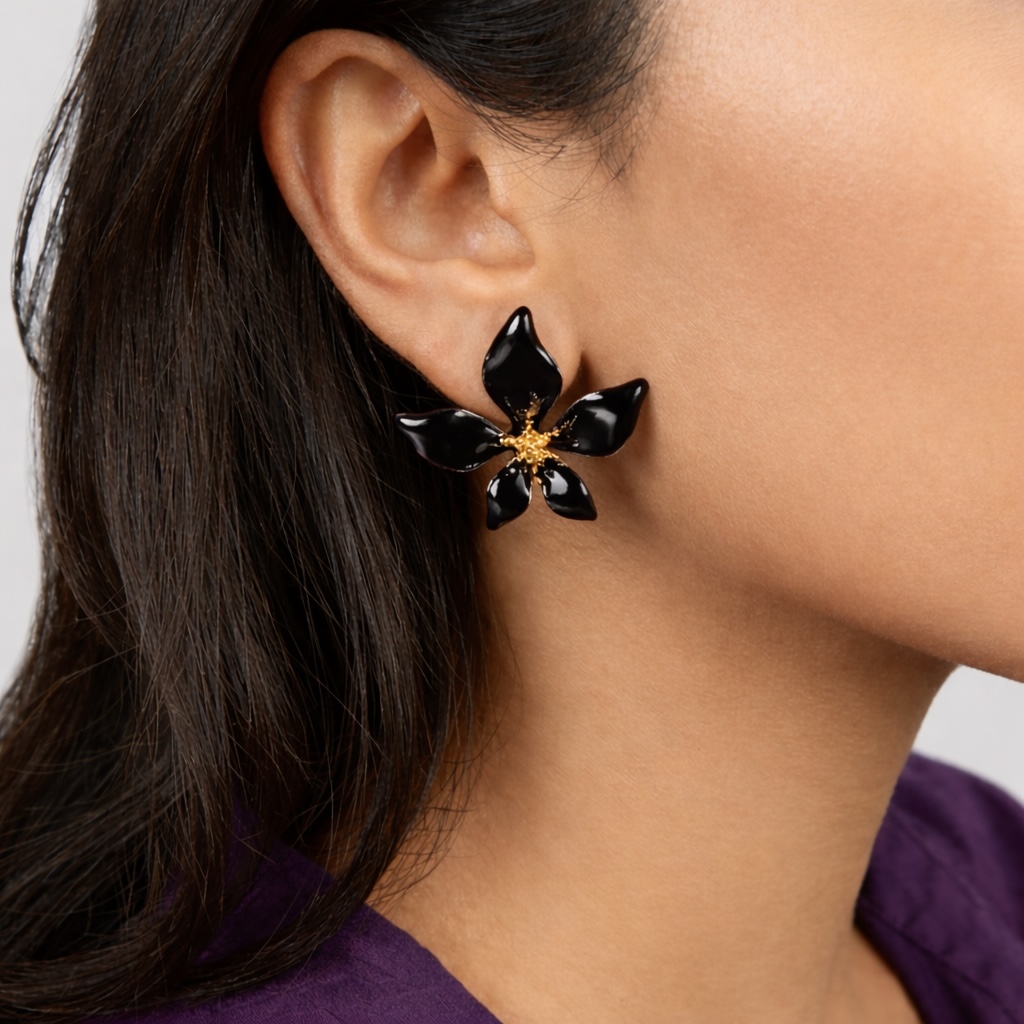 These are for the days when you want to look polished but with a bit of an edge. The deep, glossy black enamel is sleek and mysterious, creating a stunning high-contrast look against the textured gold center. While floral designs are usually “sweet,” the black colorway transforms this shape into something much more modern and high-fashion.
