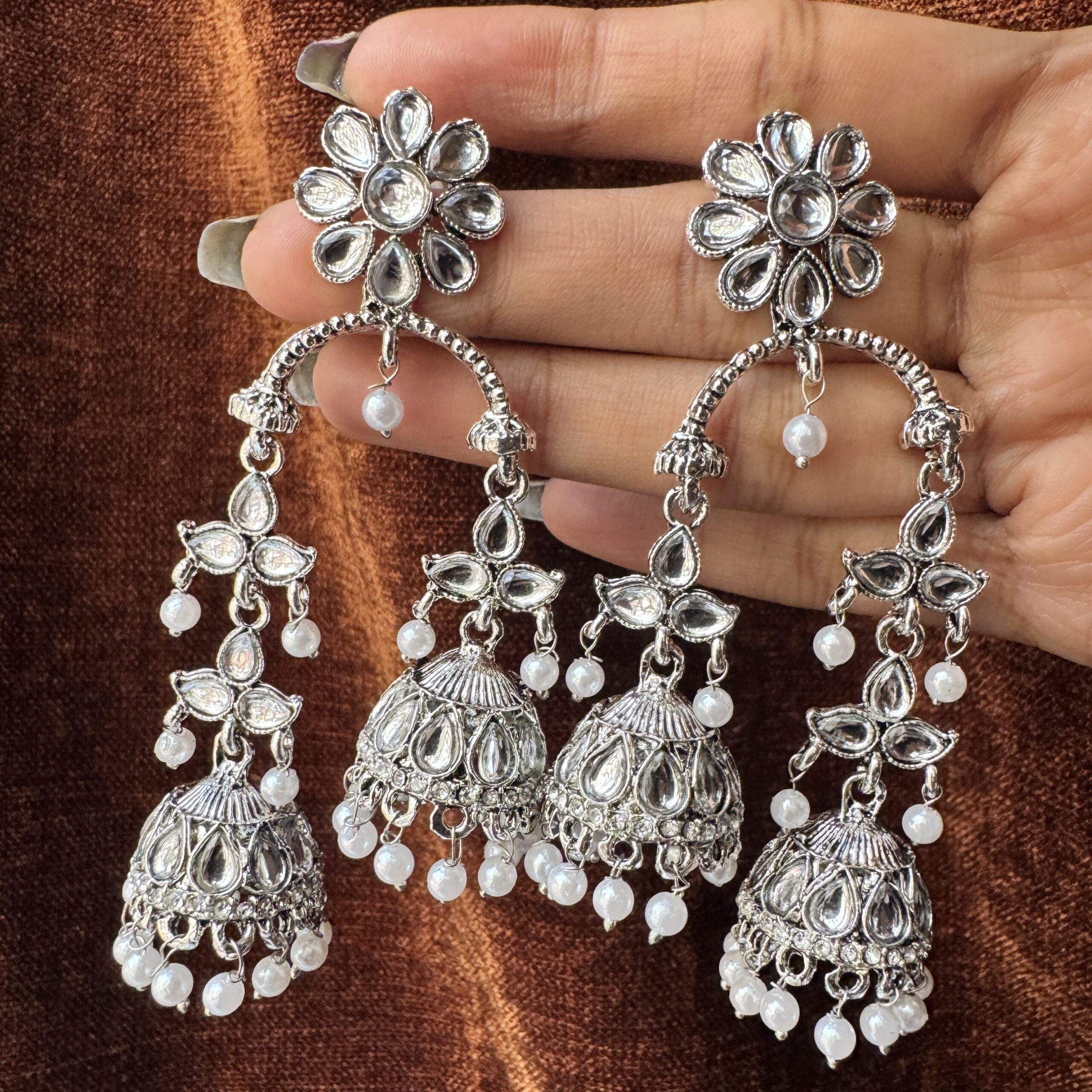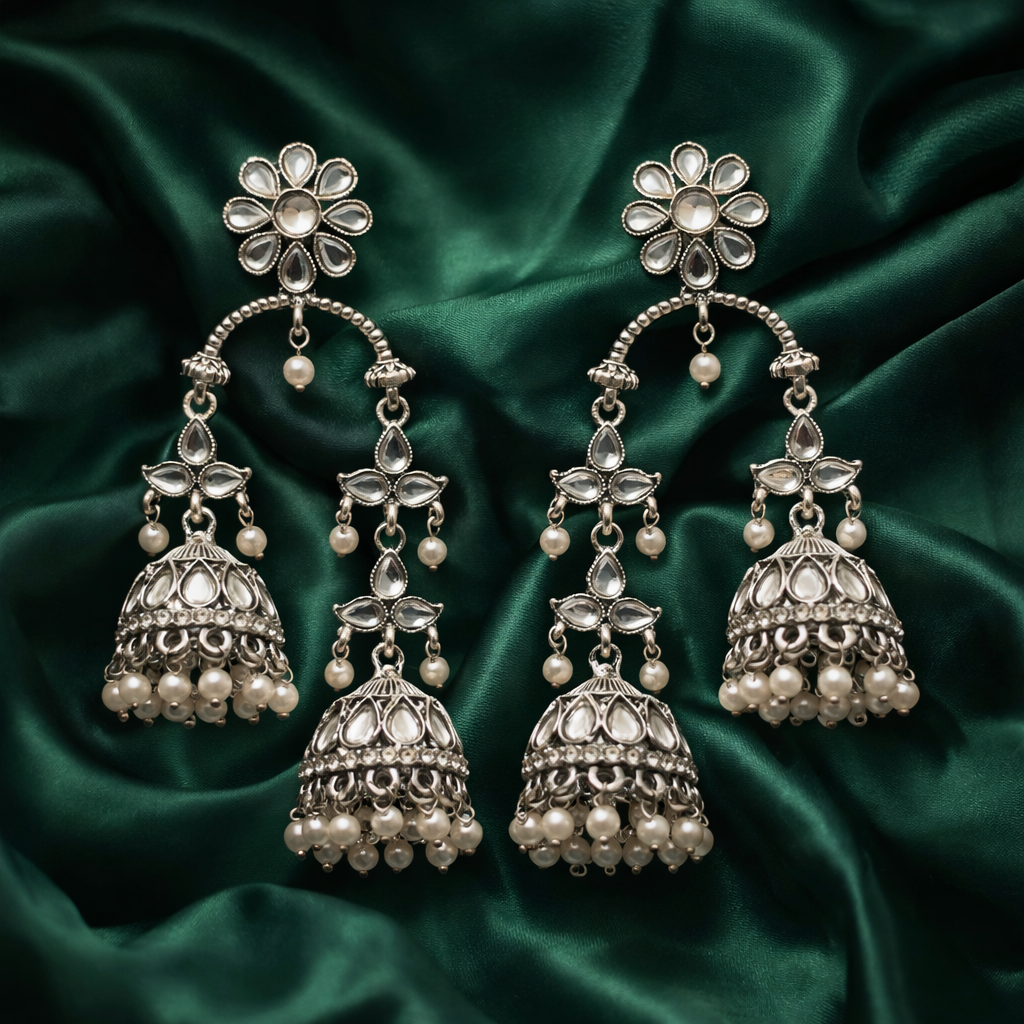 • The Detail: Intricate silver-work with double-drop Jhumkas and pearl accents.