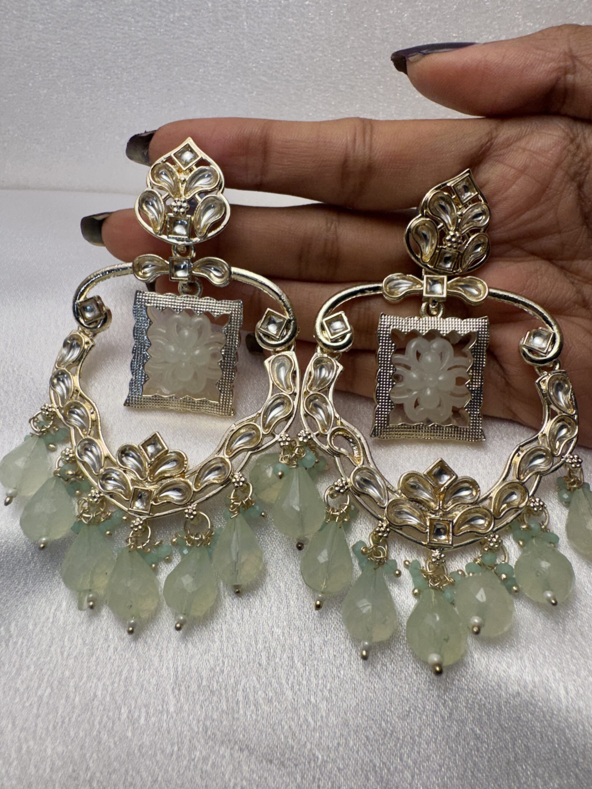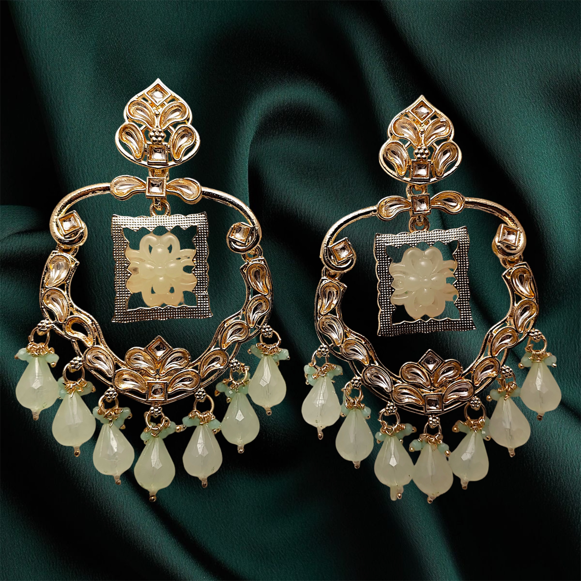 Add a breath of fresh air to your ensemble with the Mint Bloom earrings. These statement pieces feature a unique, carved floral centerpiece held within an elegant gold-toned frame, finished with a cascade of refreshing mint-green drops. They are the perfect way to blend traditional artistry with a cool, modern palette for your next big celebration.