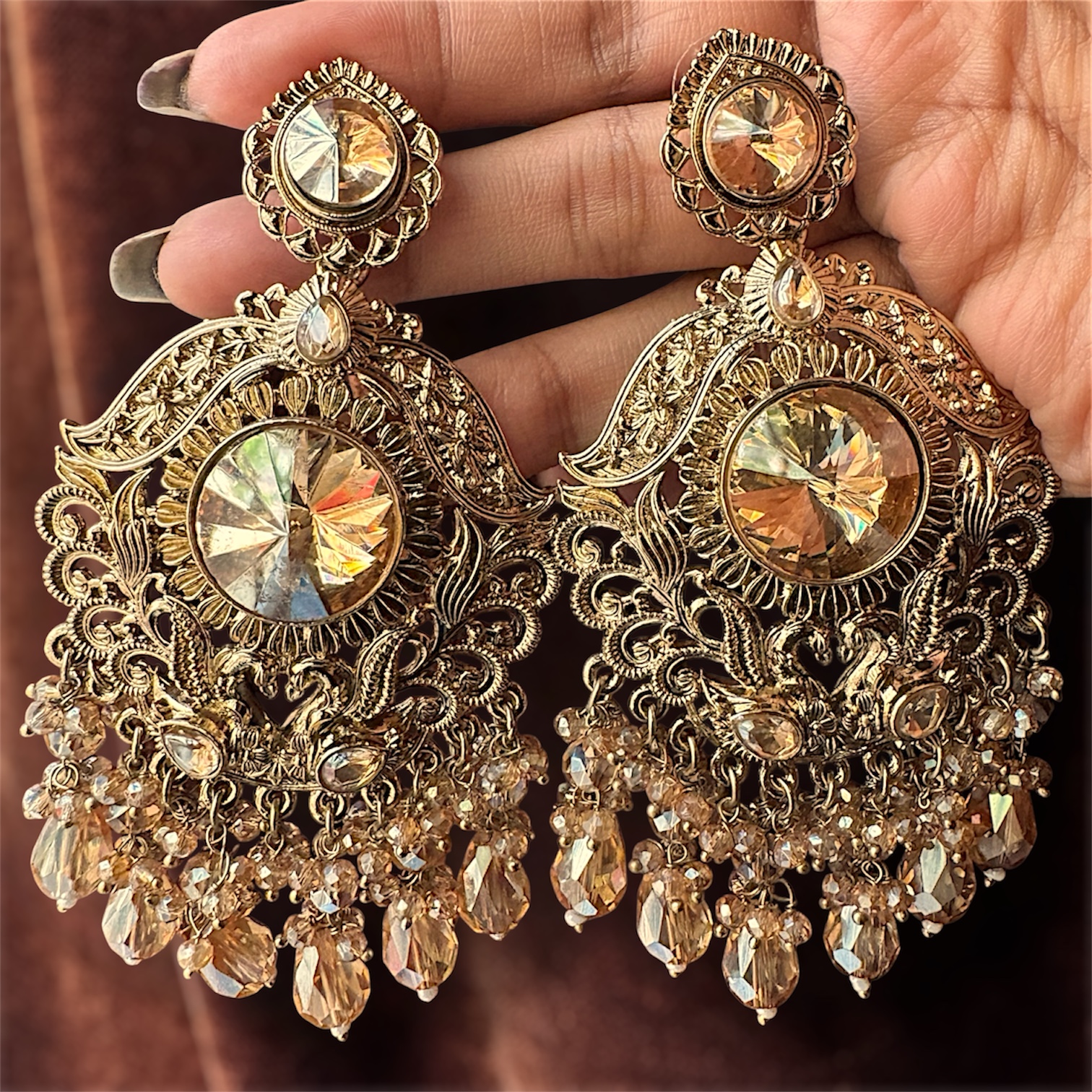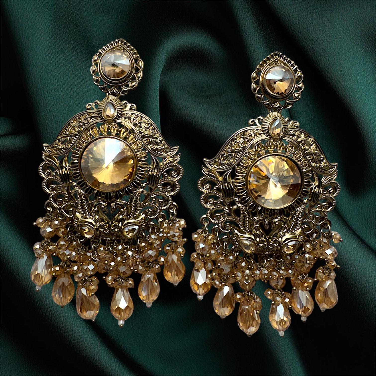 Own the room with Royal Golden Ellipse . These statement earrings feature a bold, architectural frame in an antique gold finish, centered by a magnificent champagne-toned crystal. With its intricate vintage-inspired metalwork and shimmering honey-colored drops, this piece is for the woman who loves her jewelry with a side of history and a whole lot of soul.