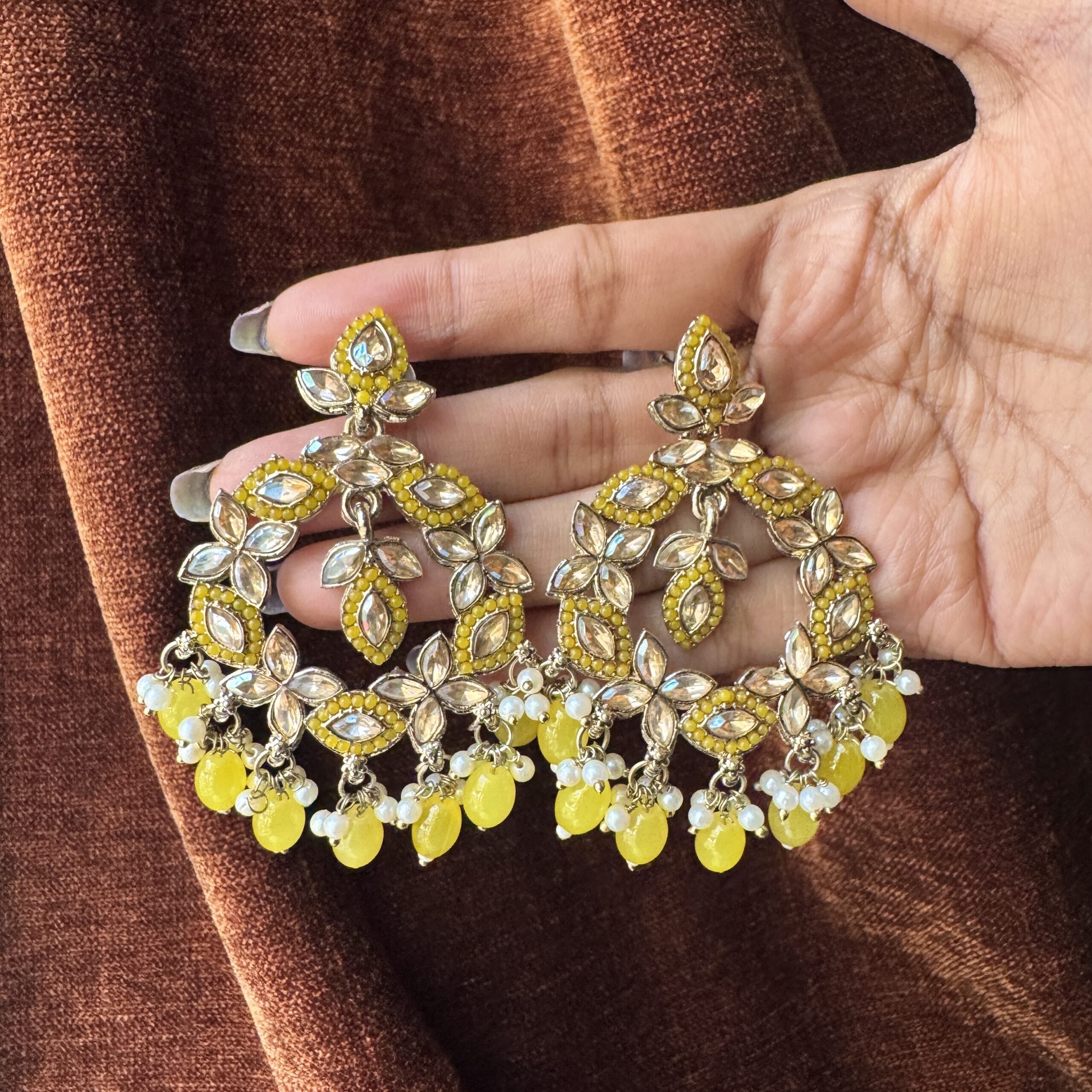 Light up your day with Yellow Floral Gaze. These stunning statement earrings feature a delicate, sun-kissed floral design accented with warm yellow beads and a soft, pearly shimmer. They are the perfect way to bring a touch of bright, cheerful elegance to your favorite ethnic looks or festive mornings.