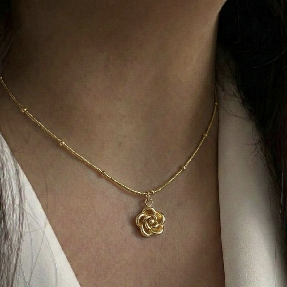 Classic romance meets modern detail. This necklace features a petite, sculpted gold rose pendant that sits beautifully on the neckline. The design is elevated by a delicate satellite chain with small gold beads, adding subtle texture and shine to this timeless piece.